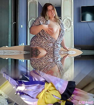 Sexy horny chubby milf in a brief bathrobe sucks my balls in bed