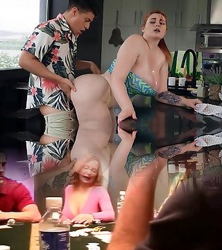 Chubby redhead Abigaiil Morris bends over for two hard stiffys