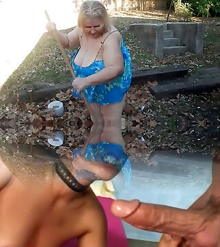 This exhibitionistic grandma knows the best way to remove leaves in her yard