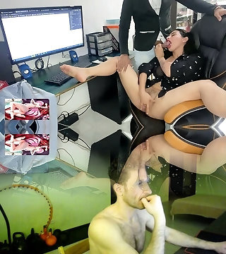 Glorious secretary sucked, jerked off with her feet and gave in the ass to the manager with a big lollipop