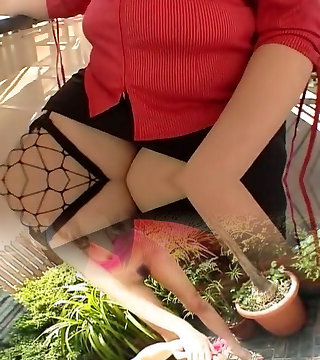 Woman Mona. In my crimson transparent skirt stockings, garter belt and high heels outside.