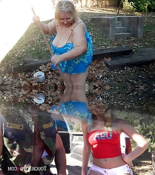 This exhibitionistic grandma knows the best way to remove leaves in her yard