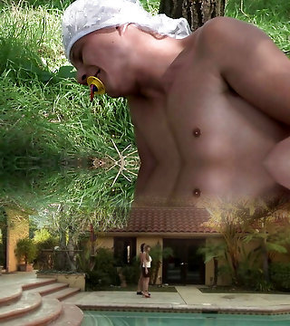 Disgusting brown-haired MILF with ugly fake hooters masturbates in inflatable pool